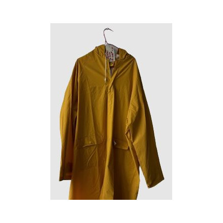 Vêtement de pluie en PVC / Polyester / PVC. Capuche fixe. 2 poches à rabat. Volet de ventilation dans le dos. Œillets d'aération sous les bras. Elastiques aux poignets.